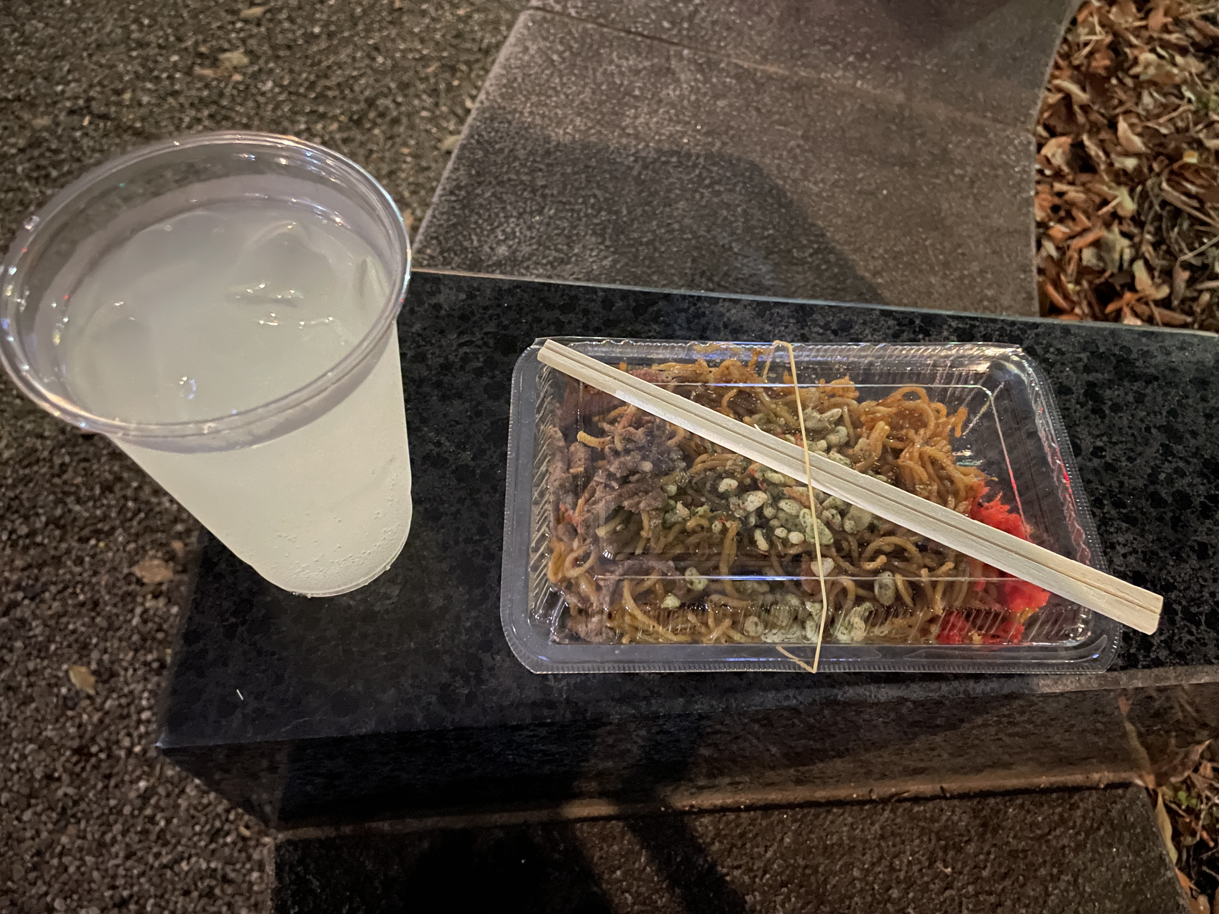 目的地につくと、目当ての場所は桜ではない木の下だからかそこまで人がおらず、普通に座れた。(が、この暗闇で木のすぐ近くに座るのはなんかちょっと虫とか付きそうで嫌だったのですぐに一旦コップだけ置いて急いで焼きそばを食べた。)