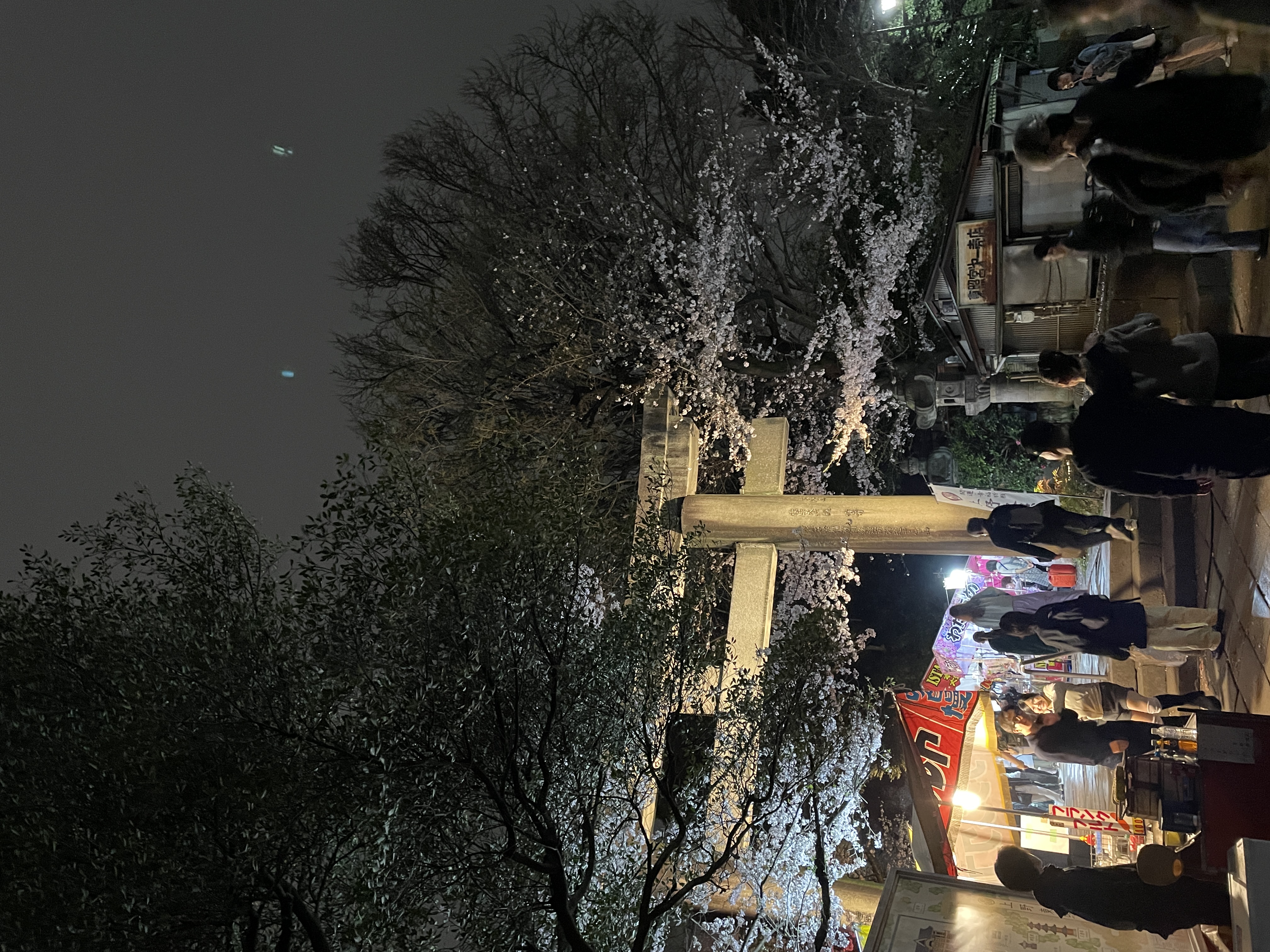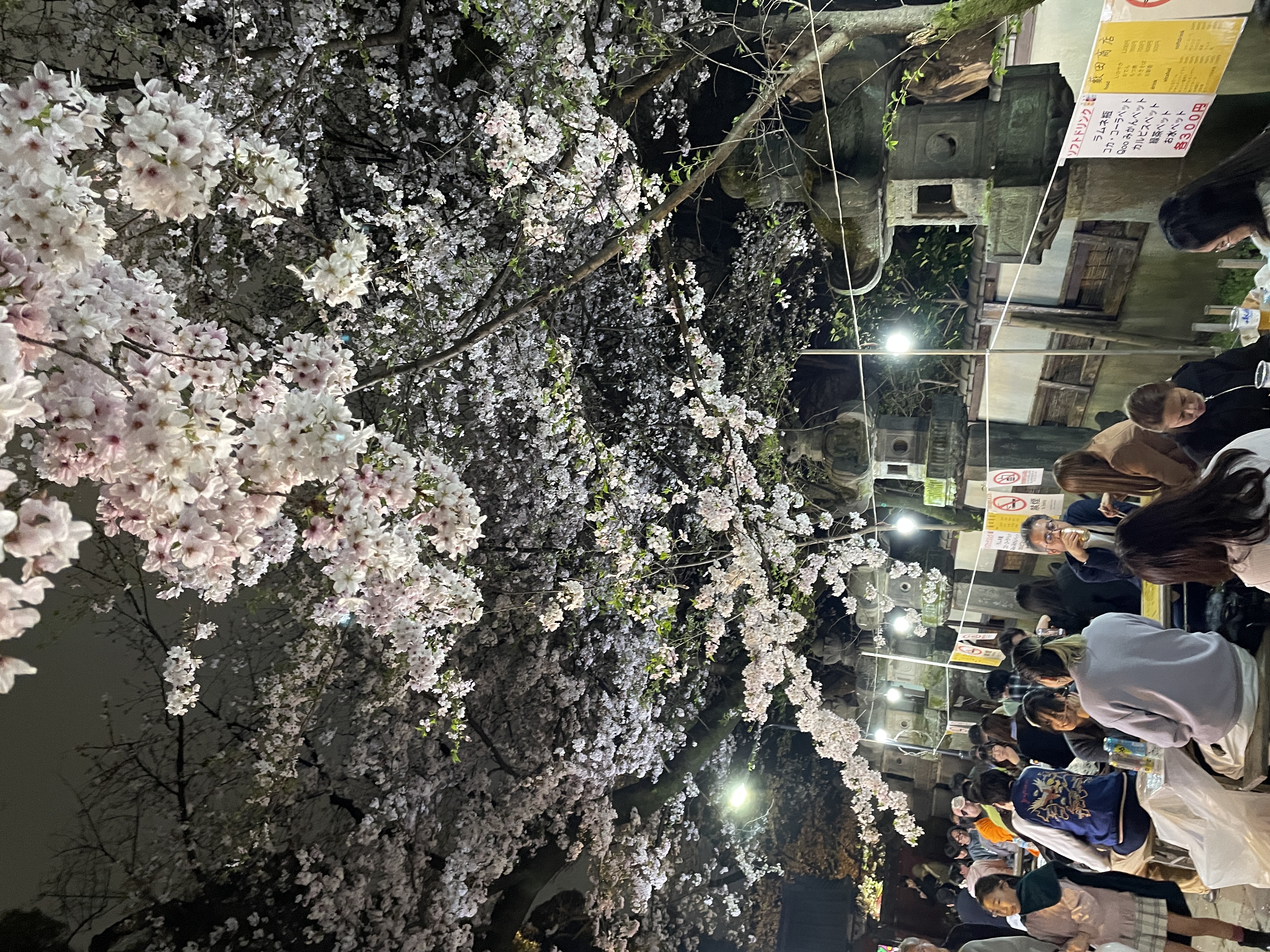 少し歩いてみると、東照宮の参道沿いに今まで見たのとは違う組織(おそらく地元の商店?)の出店が並んでいるのを見つけた。先ほどまでの提灯とは違い単に白い電球で明かりを採っているため、桜の色ががまた変わって面白い。
